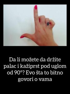 Svako od nas može spojiti palac i kažiprst i napraviti oblik sličan slovu „L“. Ipak, zanimljivo je da način na koji to radimo nije uvijek isti. Kod nekih ljudi ugao između ova dva prsta gotovo savršeno formira prav ugao od 90 stepeni, dok je kod drugih taj ugao znatno manji. Iako se radi o vrlo jednostavnom gestu, neki psiholozi smatraju da ovakvi sitni fizički detalji ponekad mogu biti povezani s određenim osobinama ličnosti.