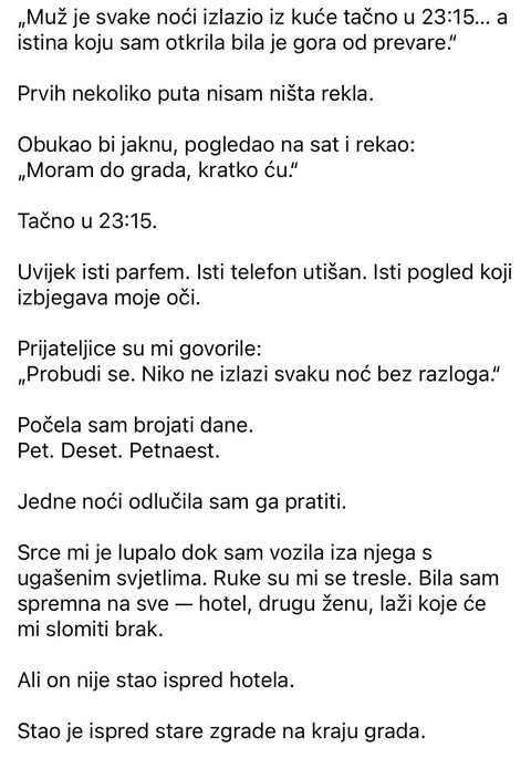Kada ga odluči pratiti, srce joj preskoči. Vozila je tiho, s ugašenim svjetlima, ruke joj drhte dok razmišlja o mogućim scenarijima – od hotela do druge žene, sve do laži koje bi mogle uništiti njihov brak. Ova vožnja postaje metafora njenog unutarnjeg nemira, gdje svaki zavoj na cesti donosi sve dublju sumnju. Međutim, kada muž staje ispred stare zgrade, njena zabrinutost se pretvara u radoznalost. Tiho ga prati do stepenica, a srce joj udara brže nego ikad. U tom trenutku, gubi se u svojoj mašti, zamišljajući sve moguće ishode, ali ni u jednom od njih ne može predvidjeti ono što će ubrzo otkriti.