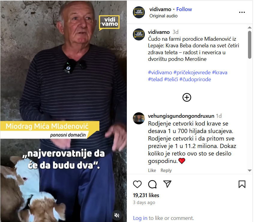 Porodica Mladenović, koja je vlasnik krave Bebe, nikada nije mogla ni zamisliti kakvo iznenađenje ih čeka te noći. Dok su se pripremali za teljenje, Milena, supruga domaćina Miodraga, primijetila je da nešto u zraku nije uobičajeno. Veterinar Zoran, koji je bio prisutan, također je osjetio uzbuđenje i iščekivanje nečeg izvanrednog. Uobičajeno teljenje obično donosi jedno ili dva teleta, stoga su bili skeptični kada su počeli razmišljati o mogućim blizancima. Ipak, stvarnost ih je iznenadila kada je Beba na svijet donijela čak četiri teleta, preobražavajući njihovu večer u nezaboravan trenutak.