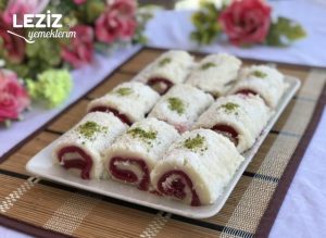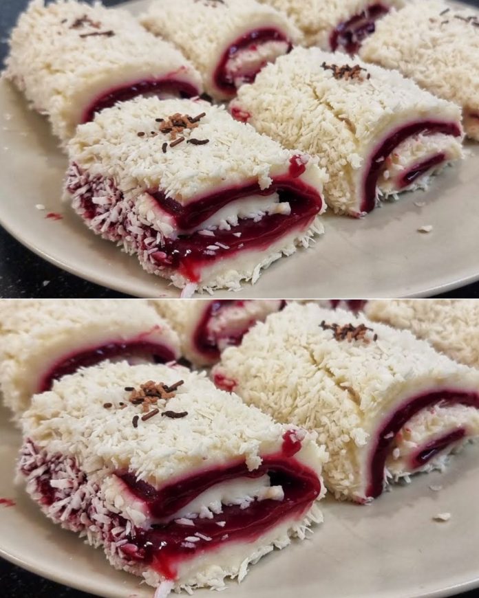 Osnova ovog deserta je nježna i kremasta kokos baza koja podsjeća na lagani puding. Njena tekstura je glatka i mekana, ali dovoljno čvrsta da se može oblikovati u rolu. Ono što je čini posebnom jeste jednostavnost sastojaka – mlijeko, šećer, brašno i malo maslaca stvaraju savršenu podlogu za ostatak kombinacije.